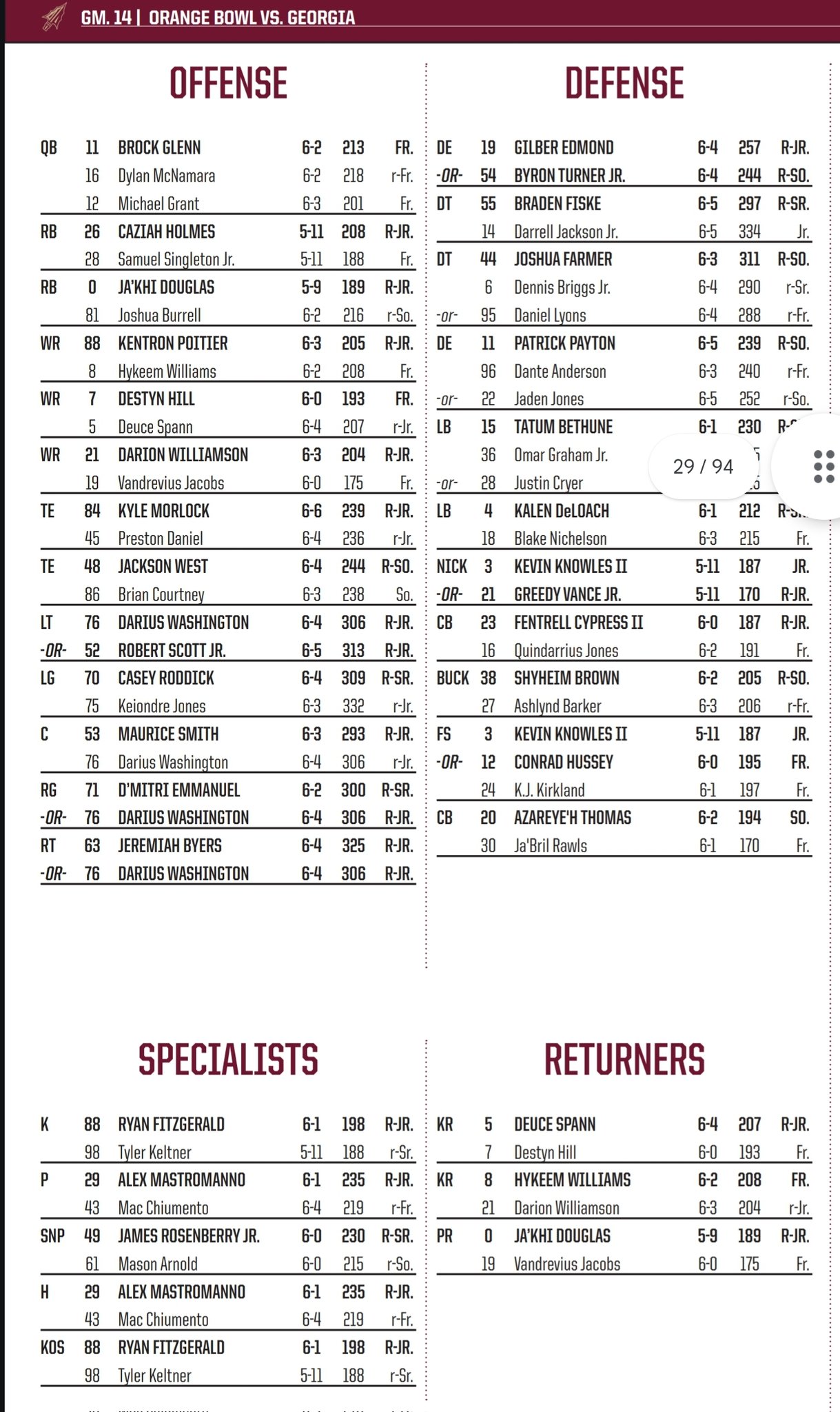 Ehsan Kassim on X: “FSU releases depth chart for Orange Bowl